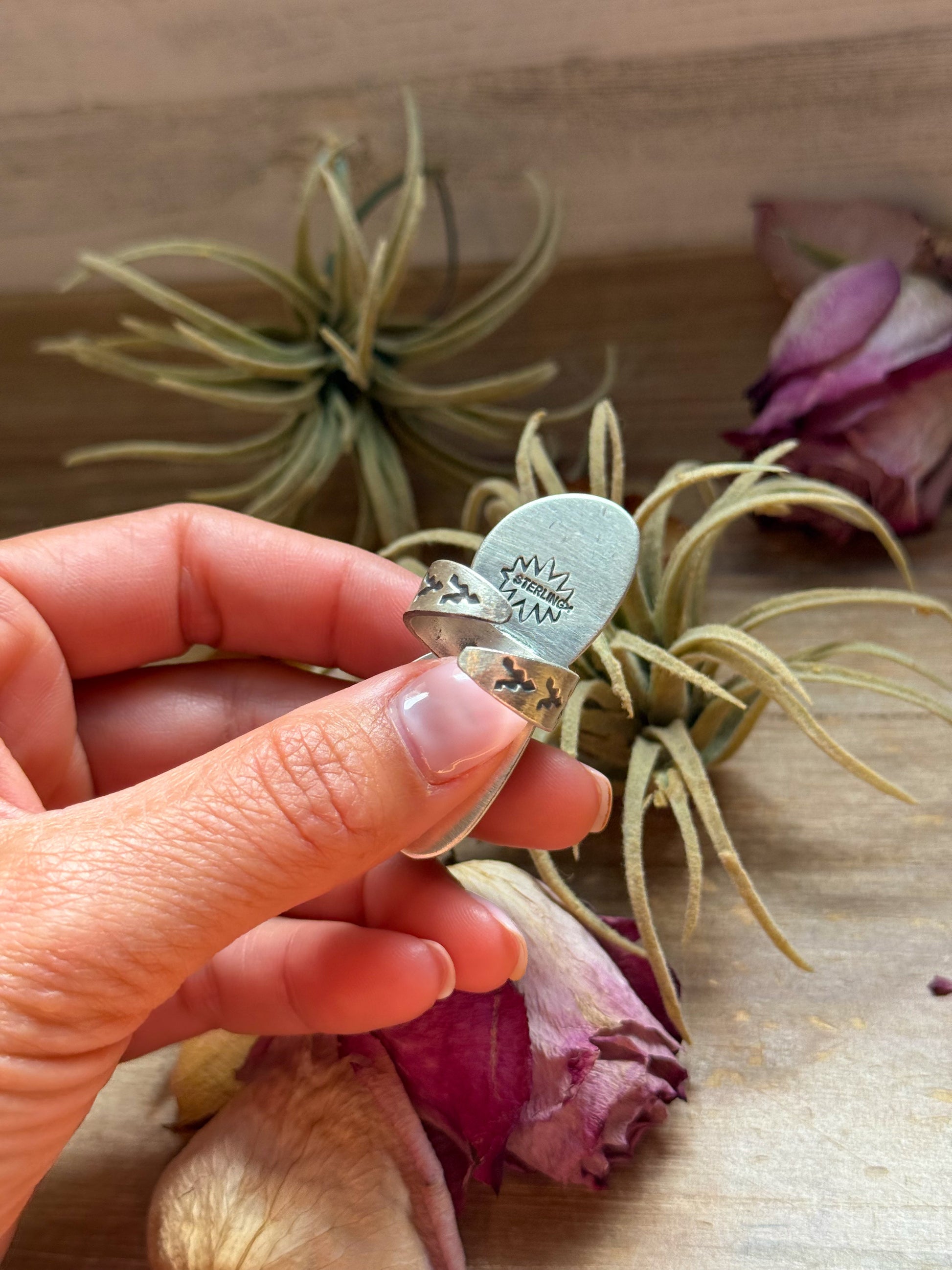 Stamped STERLING, this adjustable ring offers a comfortable, customizable fit and elegant open design. The double-stone layout gives it a balanced, eye-catching look — perfect as a statement piece or for stacking with your favorite silver rings.